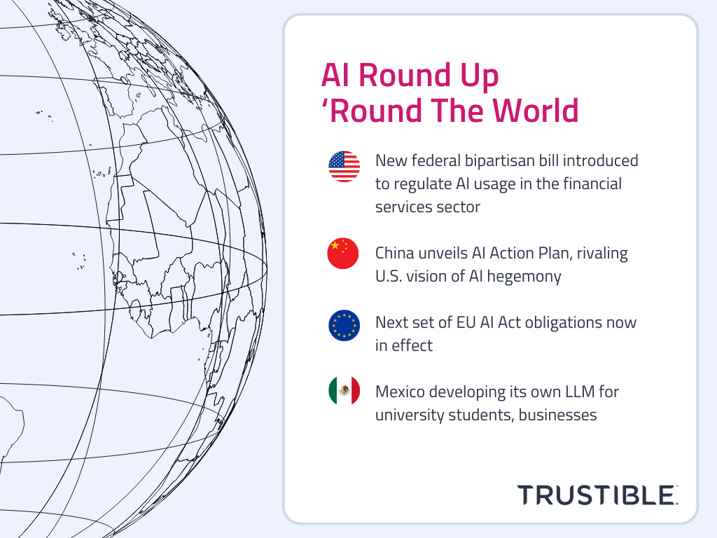 U.S. Federal Government. Beyond releasing the AI Action Plan, the Trump Administration is leaning on Asian countries to develop an AI approach that differs from the EU. The Securities and Exchange Commission also announced an AI task force aimed at improving AI adoption across the agency. In Congress, Senator Mike Rounds (R-UT) introduced a bipartisan bill on setting guardrails for AI usage in financial services.